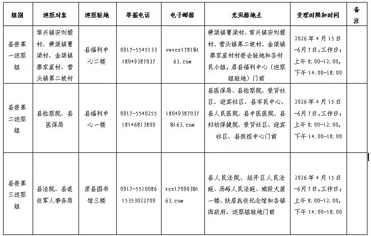 按照安排,本轮巡察将从4月下旬开始、6月中旬结束,为期2个月。巡察期间分别设专门举报电话、意见箱、电子邮箱等,受理被巡察党组织领导班子及其成员、下一级党组织领导班子主要负责人和党员领导干部问题的来信来电来访,重点是关注落实中央重大决策部署及省市县委要求、群众身边不正之风及腐败问题、基层党组织建设、违反“六项纪律”等方面的举报和反映。其他不属于巡察受理范围的信访问题,将按规定移交有关部门处理。巡察组受理信访时间截止2026年6月7日。